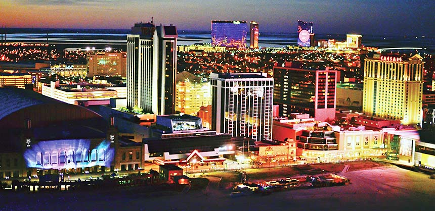 An aerial view of Atlantic City’s casino hotels and resorts along The Boardwalk.