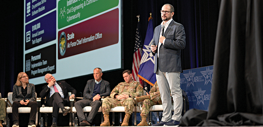 The onsite AV company at Gaylord Rockies, Encore, offers state-of-the-art equipment for presentations and events, such as at the 2023 AFA Warfare Symposium Spark Tank, pictured. Air & Space Forces Association