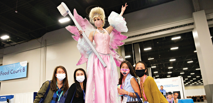 Attendees of the most recent American Dental Association’s annual SmileCon enjoy the entertainment. Inset, attendees at the most recent American Public Health Association annual meeting also have a bit of fun while playing brain-teaser games. ADA SmileCon 2021 / E3 Photography