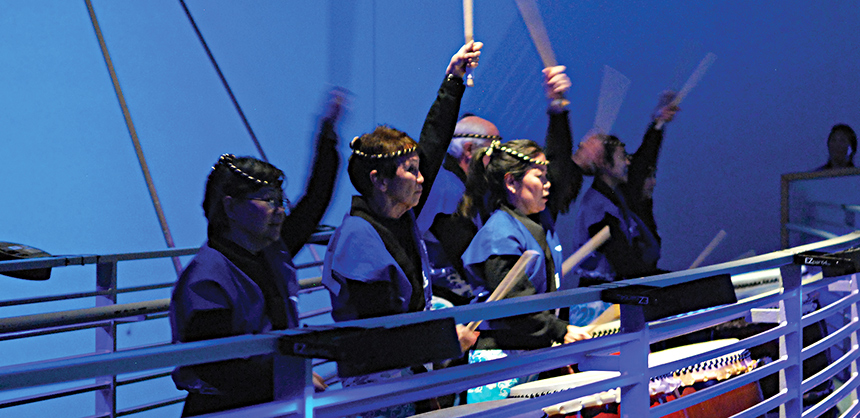 Taiko drummers perform at an event after thunderstorms forced opening night activities planned outside to move inside. Photo Courtesy of Greg Jenkins