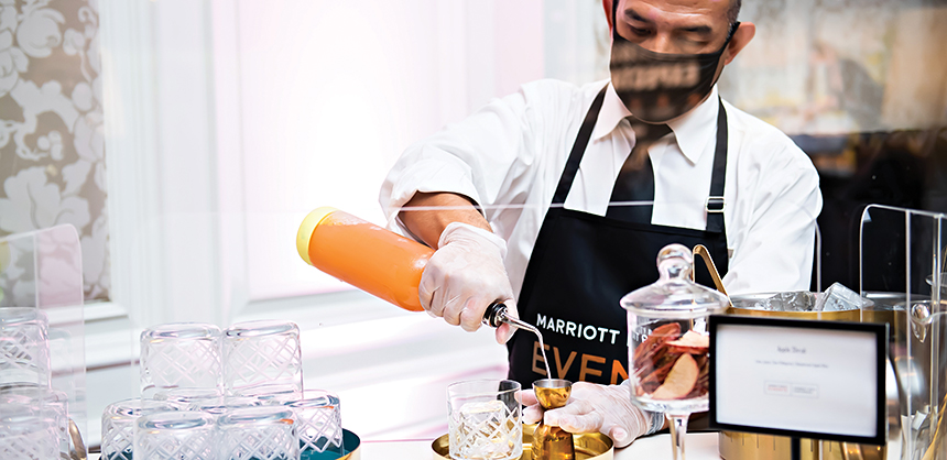 And due to the pandemic, how food and beverages are served is as important as what’s served. For example, at The Ritz-Carlton, Tysons Corner, they’ve introduced bento-style and/or market-style presentations in their meetings and events. “During the stay-at-home orders, executive chef Frederic Barasse and I brainstormed on how to best serve a function,” Stiffler says. “In response, we created bento-style breakfast, lunch and dinners, which are served on beautiful acrylic trays. For the events that want a more traditional buffet experience due to the array of options, we created market-style buffets with food stations where each item is individual wrapped in a biodegradable container.” At these food stations, they have proper guards in place, allowing for an experience where the attendees’ and attendants’ well-being are top of mind.