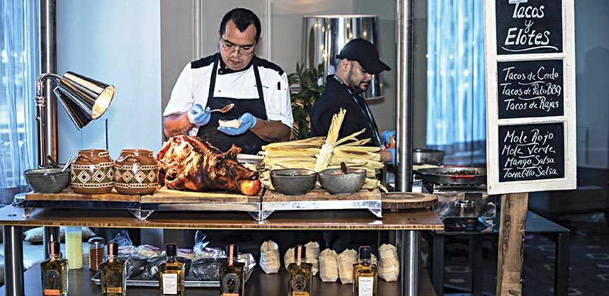 Hilton Chicago executive chef Mario Garcia says more adventurous cuisine and presentations — for example, using whole animals like this whole pig at a taco action station — are trending. Credits: Hilton Chicago