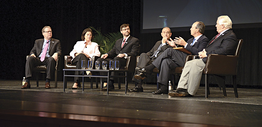 A panel discussion on the Meetings Mean Business campaign at IBTM America in Orlando included (left to right) Paul Van Deventer, Deborah Sexton, Kevin Hinton, John Graham IV, David Dubois and Roger Dow.