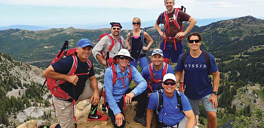 Networking was the focus of HPSI’s National Meeting & Tradeshow in Salt Lake City. In one activity, attendees selected three different hiking paths based on their level of proficiency, ending up at three different summits, respectively. Steve Borgquist, EVP national accounts (standing right, blue shirt no hat), says the hiking activity allowed the conversations to keep going and “corresponded with our theme, Race to the Summit.” EVP of sales Kirk Hess is pictured sitting in front, white hat. Credit: Kirk Hess