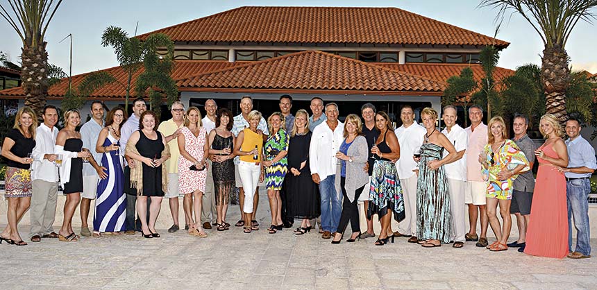 Enjoying the Matrix Communications Inc. reception at Sandals LaSource Grenada are (l to r) Karie Timion, Mark and Jocelyn Hechtl, John and Carolyn Mirviss, Brian and Lisa Finnvik, Craig and Suzanne Nordstrom, Dan Galbraith, Mary Jo McGowan, Charlie and Lori Eicher, Ann and Tom Pearson, Tammy Peterson and Jim Peterson, Steve and Kareen Ferry, Mike and Paulette Parrott, Frank Millo, Susan and Kevin Peters, Peter McAllister, Lori Robbins, Mike Ellis, Shannon and Jason Cardwell. Credit: Matrix Communications Inc.