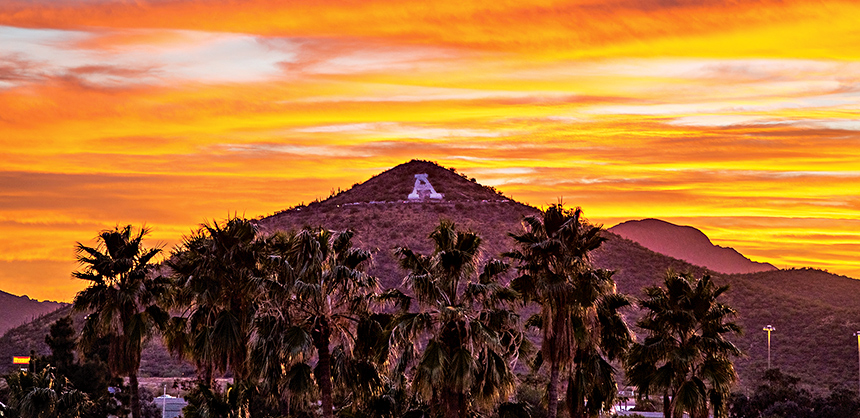 The stylized “A“ on Sentinel Peak, below, pays homage to the University of Arizona. Visit Tucson