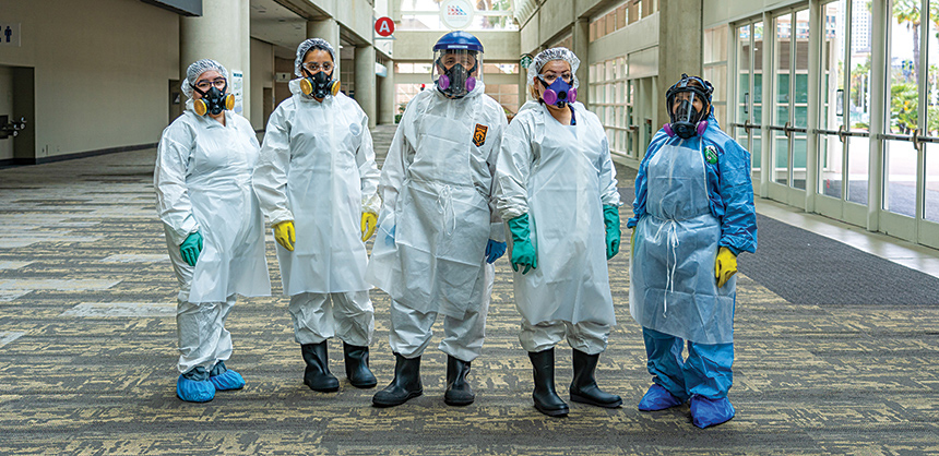 Cleaning staff at the San Diego Convention Center (SDCC) wear masks and personal protective equipment while on the job. The SDCC was one of the first venues to receive accreditation from GBAC STAR, which recognizes facilities that meet international cleanliness standards.