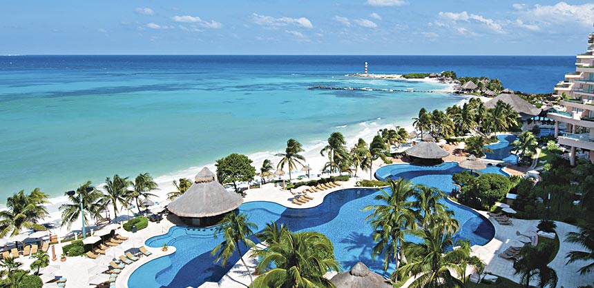 An aerial view of the inviting Fiesta Americana Grand Coral Beach Cancun Resort & Spa, which boasts Cancun’s best beach.