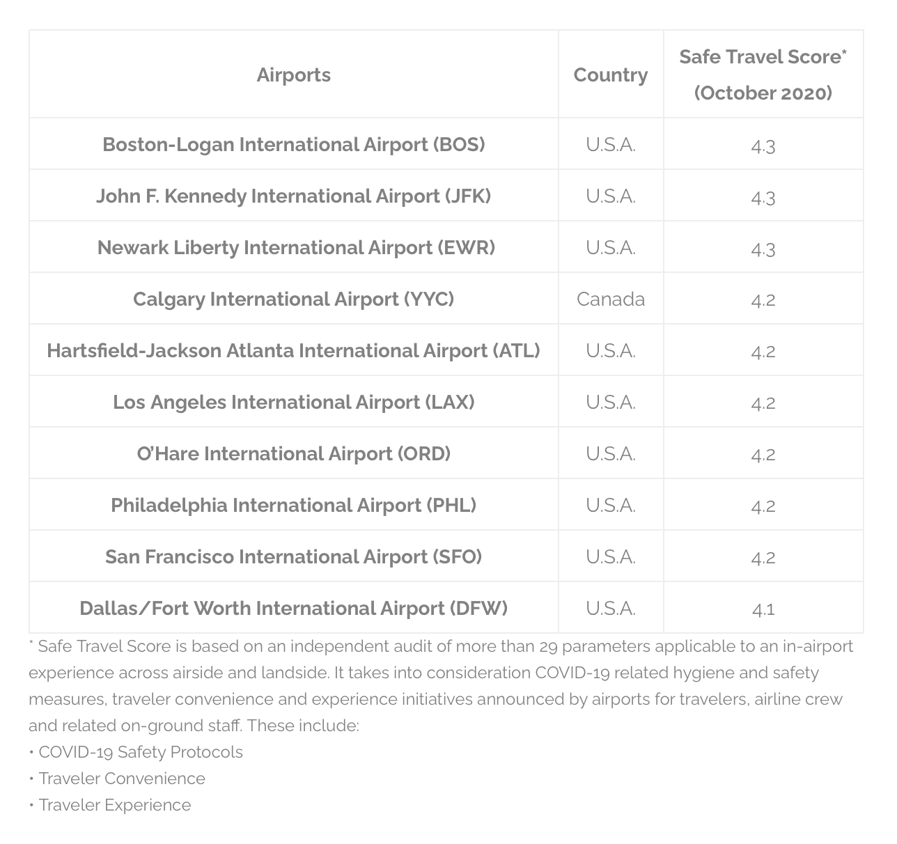 Boston-Logan International Airport (BOS), New York’s John F. Kennedy International Airport (JFK) and Newark Liberty International Airport (EWR) led the pack among North American airports with a Safe Travel Score of 4.3 out of 5. The East Coast airports play a crucial role in U.S.’ connectivity across the Atlantic. Even with the limited air traffic and lockdown in Europe, the North American airports have remained active to facilitate smooth travel for both international and domestic travelers. Canada’s Calgary International Airport (YYC) and Atlanta’s Hartsfield-Jackson International Airport (ATL) also made it to the leaderboard with a Safe Travel Score of 4.2 each.